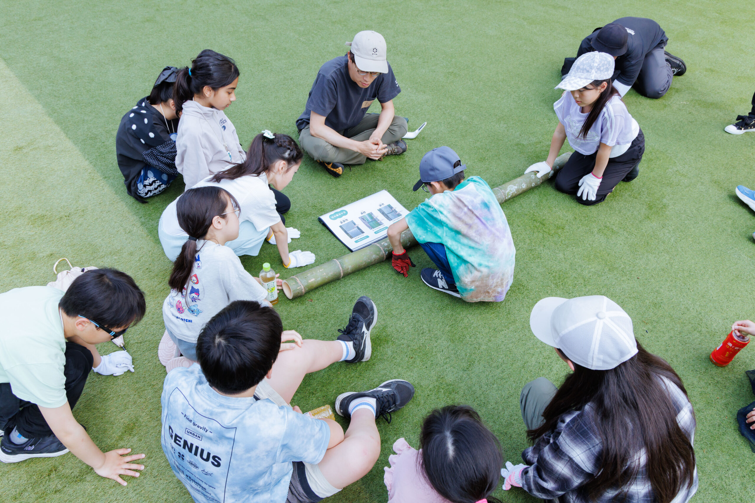 土砂崩れなどの原因となっている「放置竹林」の問題について学んだ後、山から切り出した竹をノコギリで切って天然のプランターを作ります。