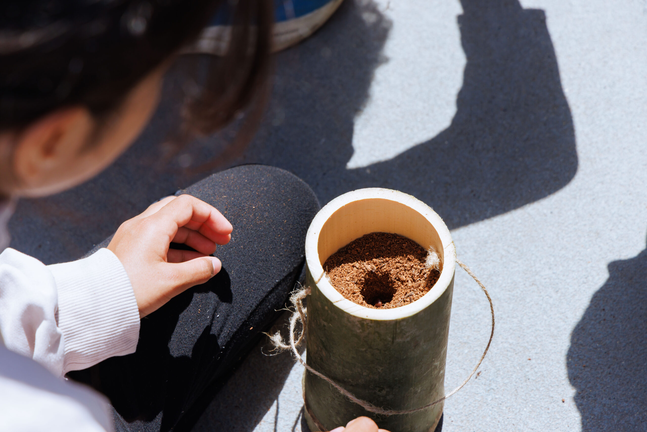 この手作りの竹プランターに植えるのは、えだまめの種。